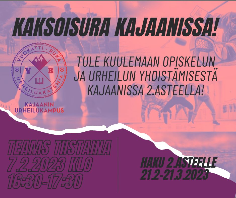 Kajaanin urheilukampus toimintaympäristö tarjoaa laadukasta lajivalmennusta, monipuolisia koulutusmahdollisuuksia sekä erinomaiset liikuntaolosuhteet ja -puitteet. Infossa mukana ovat Kajaanin alueellisen akatemiatoiminnan koordinaattori, 2. asteen oppilaitosten edustajat, Kajaanin urheilukampuksen lajivalmentajia sekä akatemiaopiskelija.