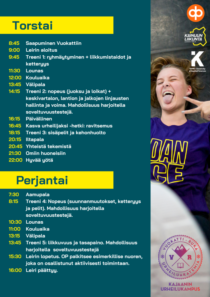 Lukuvuoden 2023–2024 ensimmäinen Kasva urheilijaksi -leiri järjestetään 16.-17.11.2023 Vuokatissa. Leiri on yöleiri, ja aikataulu on alla. Marraskuun leirin teemoina ovat kehonhallinta, ketteryys, liikkuvuus, nopeus ja liikkumistaidot. Kasva urheilijaksi -hetken teemana on ravitsemus. Leirin hinta on 130,00 €/hlö, joka sisältää majoituksen, ruokailut, valmennuksen ja muun ohjatun toiminnan.