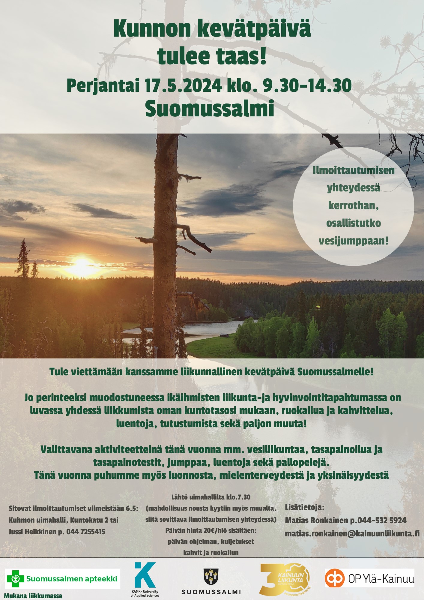 Päivän ohjelmaa järjestetään niin Suomussalmen liikuntahallilla kuin Kiannon Kuohujen kylpylässäkin. Tapahtumassa on tarjolla ohjattua tuolijumppaa, sauvakävelyä, vesijumppaa sekä muuta mukavaa liikunnallista tekemistä. Päivän aikana osallistuja voi valita omalle kunnolleen sopivia liikuntamuotoja sekä oman kunnon tasoisia liikuntaryhmiä.  Tapahtumaan on ennakkoilmoittautuminen 7.5. mennessä, ja tarkemmat ilmoittautumistiedot löydät alta. Tapahtuman osallistumismaksu on 20,00 €/hlö, joka sisältää tapahtumaan osallistumisen aktiviteetteineen, tervetulokahvit ja keittolounaan Ruukinkankaan koululla. Kaikista Kainuun kunnista järjestetään kuljetus tapahtumaan. Kyytimaksu on kuntakohtainen.