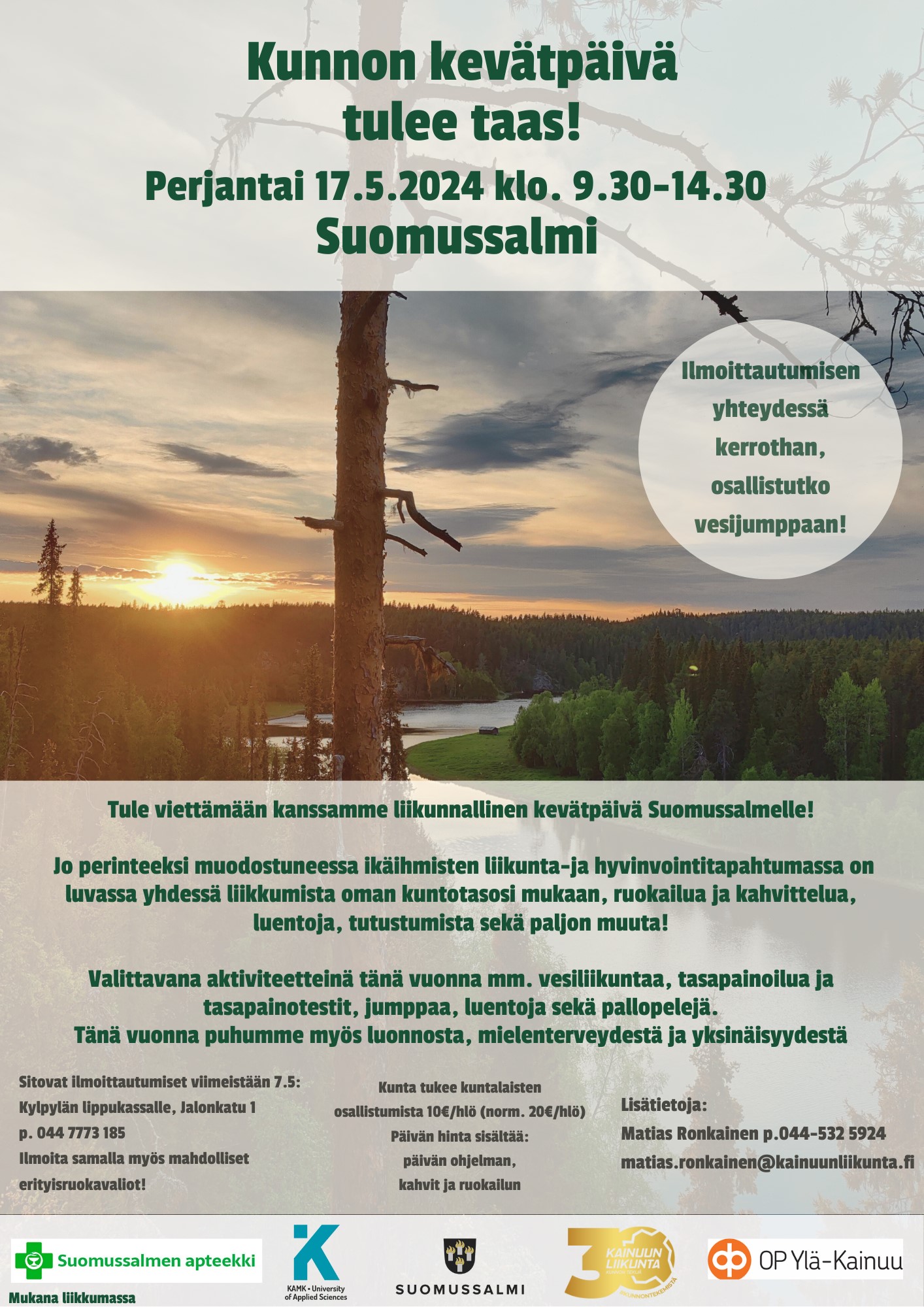 Tänä keväänä perinteinen ikäihmisten liikuntatapahtuma Kunnon kevätpäivä järjestetään Suomussalmella perjantaina 17.5.2024 klo 9.30-14.30.