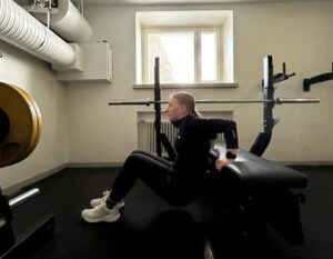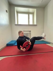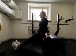 Suoritusohjeet: Nojaa hieman taaksepäin ja kierrä ylävartaloa puolelta toiselle. Pyri pitämään jalat ilmassa samassa asennossa koko suorituksen ajan. Voit keventää liikettä laskemalla kantapäät maahan. Lisähaastetta saat lisäpainoista.