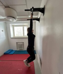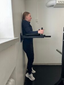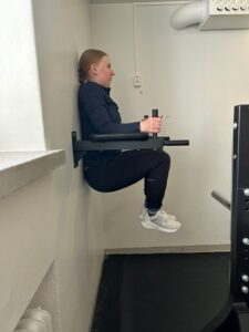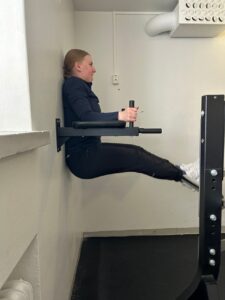 Suoritusohjeet: Tartu käsikahvoihin ja aseta selkä tukevasti seinää vasten. Nosta itsesi kahvoille siten, että jalat ovat ilmassa. Nosta jalkoja hallitusti niin ylös kuin pystyt, palauta takaisin lähtöasentoon. Lisähaasteetta saat pitämällä jalat suorana koko liikkeen ajan.