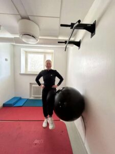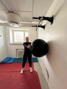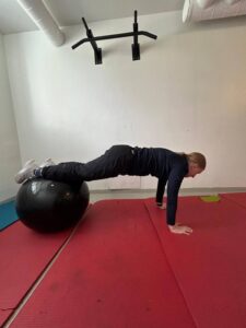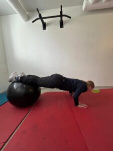 Suoritusohjeet: Hae hyvä tasapaino suorille jaloille pallon päälle. Ota käsillä tukipisteet noin hartioiden alta. Punnerra hallitusti alas ja ylös. Vie kyynärpäitä alaviistoon tai suoraan taaksepäin. Pidä hyvä tasapaino koko suorituksen ajan.