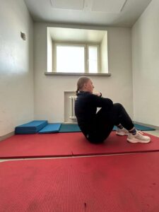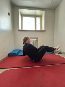 Suoritusohjeet: Pyri pitämään jalat maassa toistojen aikana. Nosta ylävartalo ylös pyöristäen selkää ja kosketa kyynärpäillä polvia. Laskeudu hallitusti alas pyöristäen selkää niin, että hartiat ottavat maahan ja aloita uusi toisto.