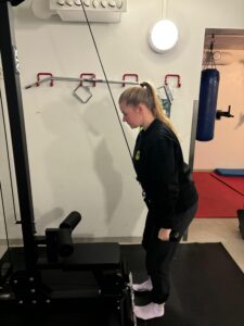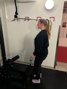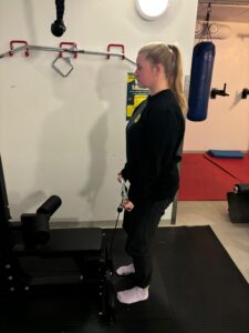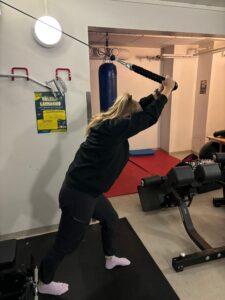 Suoritusohje: Asetu seisomaan poispäin taljalaitteesta. Ota taljan naruista kiinni ja tuo kädet lähelle päätä kyynärpäät eteenpäin. Lähde ojentamaan käsiä suoraksi eteenpäin. Palauta liike takaisin hallitusti alkuasentoon.