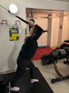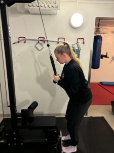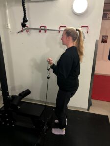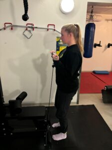 Suoritusohje: Ota yhdellä kädellä kiinni kahvasta. Jännitä keskivartalo. Pidä olkavarsi kiinni kyljessä ja tuo naru alhaalta ylös pitäen kämmenet sisäänpäin ja peukalo kohti kattoa. Palauta liike lähtöasentoon hallitusti.