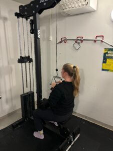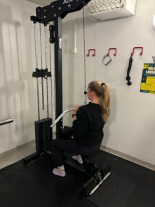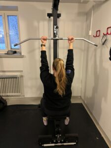 Suoritusohjeet: Istu laitteeseen ja säädä reisituki tukemaan reisiä. Ota leveä ote tangosta, laske hartiat alas ja aktivoi selkä. Lähde vetämään tankoa kohti rintakehää, samalla tuoden lavat yhteen. Palauta liike rauhallisesti takaisin lähtöasentoon pitäen hartiat koko ajan alhaalla.