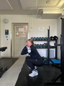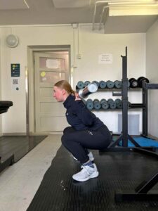 Suoritusohjeet: Nosta tanko niskan taakse jonkin verran niskaa alemmas lapaluiden päälle. Ota hartioiden levyinen asento ja kyykkää suoralla selällä mahdollisimman syvälle. Pitääksesi tangon painon tasaisena, vie takapuoltasi hieman enemmän taaksepäin.
