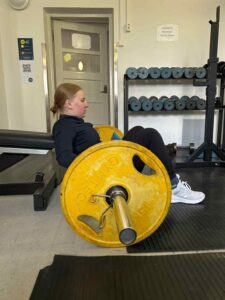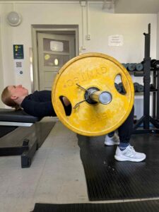 Suoritusohjeet: Istu lattialle penkkiä vasten ja aseta tanko lantion päälle. Aseta jalat koukkuun hartioiden leveydelle. Tartu tankoon myötäotteella ja ojenna lantio ylös, niin tanko nousee kohti kattoa. Yläasennossa sääret ovat kohtisuorassa ja polvet 90 asteen kulmassa. Pidä kantapäät tiukasti lattiassa koko suorituksen ajan.