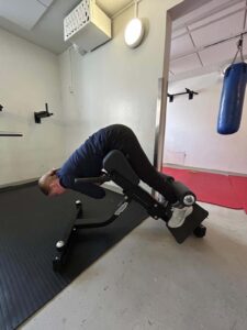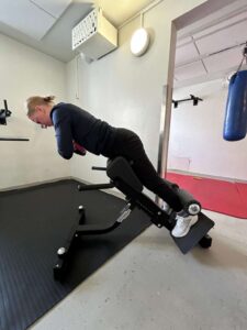 Suoritusohjeet: Säädä laite niin, että jalkatuki on nilkkojen yläpuolella ja lantion tuki lonkkaluun alapuolella. Lähtöasennossa lantio on ojennettuna. Laskeudu hallitusti alas taivuttamalla lantiosta. Kun lantio on taipunut noin 90 astetta, ojenna lantio ja nosta ylävartalo takaisin lähtöasentoon. Halutessasi saat liikkeeseen lisärasittavuutta kannattelemalla levypainoa käsissä liikkeen ajan.