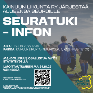 Kainuun Liiikunta järjestää alueensa seuroille seuratuki-infon tiistaina 25.10.2022 klo 17.00-18.00 Kainuun Liikunnan tiloissa osoitteessa Ketunpolku 1, Rakennus Tieto 1, Kajaani. Tilaisuuteen on mahdollista osallistua myös etäyhteydellä